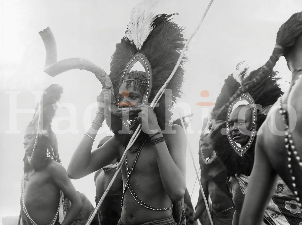 A Moran warrior is seen pictured blowing the horn of a sacred kudu